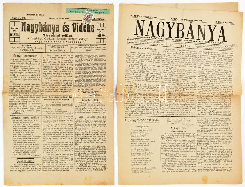 Description: 1917 Nagybánya, társadalmi és szépirodalmi hetilap, XXV. évf. 11. sz., 1917. márc. 15., kisebb szakadásokkal, 4 p. + 1919 Nagybánya és Vidéke, társadalmi hetilap, 1919. okt. 19., (4) p.