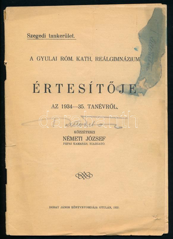 1935 A gyulai róm. kath. reálgimnázium értesítője az 1934-35. tanévről... https://www.darabanth.com/en/438-Online-auction/438.0/Art-and-other-collectibles/Printed-Materials~1000005/1935-A-gyulai-rom-kath-realgimnazium-ertesitoje-az-1934-35-tanevrol-Gyula-Dobay-Janos-~II2826818