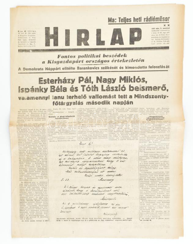 https://www.darabanth.com/en/438-Online-auction/438.0/Art-and-other-collectibles/Printed-Materials~1000005/1949-A-Hirlap-IV-evfolyamanak-330-szama-cimlapon-a-Mindszenty-per-reszleteivel~II2869473