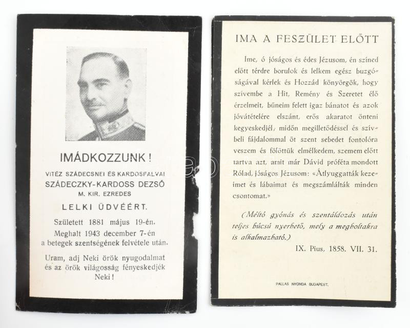 Description: 2 db Gyászlap, fénykép és gyászima. 7,5 x 11,5 cm. Sándor Kálmánné Dindár Ilona , Szádeczky-Kardoss Dezső m.kir. ezredes született 1881 május 19-én meghalt 1943. december 7-én.