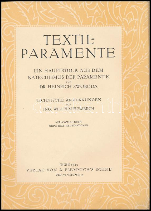 Swoboda, Heinrich - Flemmich, Wilhelm: Textilparamente. Wien, 1920, A. Flemmich's Söhne, 107 p. Fekete-fehér képekkel illusztrálva. Német nyelven. Kiadói papírkötés, kissé kopott borítóval, sérült gerinccel, laza fűzéssel.