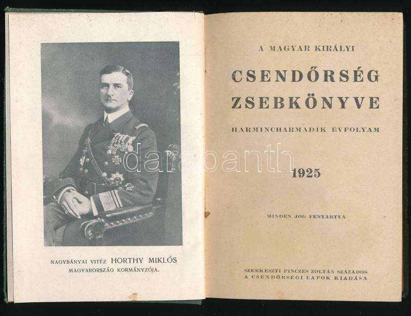 https://www.darabanth.com/en/438-Online-auction/438.0/Books/Books-History~1000011/1925-A-Magyar-Kiralyi-Csendorseg-zsebkonyve-1-t-Horthy-Miklos-arckep-plus-376-p-plus-10-p-rekl~II2865046