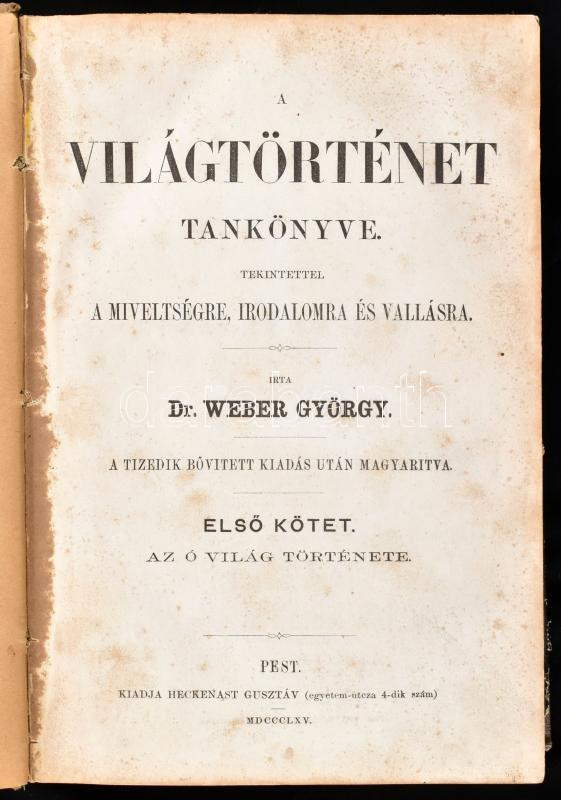 Weber György: A világtörténet tankönyve. Tekintettel a miveltségre, irodalomra, és vallásra. I. köt.: Az ó világ története. Pest, 1865, Heckenast Gusztáv, 4+501+3 p. Korabeli félvászon-kötésben, kopott borítóval, foltos lapokkal,későbbi possesosri bejegyzésekkel.