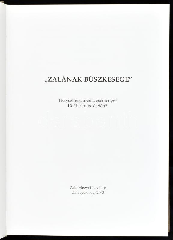 Description: "Zalának büszkesége." Helyszínek, arcok, események Deák Ferenc életéből. Szerk.: Molnár András. Megjelent Deák Ferenc születésének 200. évfordulóján. Zalaegerszeg, (2003.), Zala Megyei Levéltár. Gazdag képanyaggal illusztrált. Kiadói kartonált papírkötés