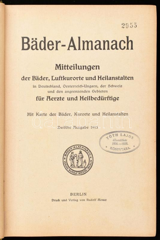 Bäder-Almanach. Mitteilungen der Bäder, Luftkurorte und Heilanstalten in Deutschland, Österreich-Ungarn, der Schweiz und den angrenzenden Gebieten für Ärzte und Heilbedürftige. Berlin, 1913, Rudolf Mosse. Kiadói egészvászon kötés, kopottas állapotban