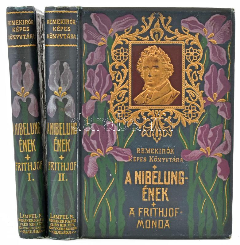 Description: A Nibelung-ének és a Frithiof-monda I-II. köt. Ford.: Szász Károly, és Győry Vilmos. Remekírók Képes Könyvtára. Bp., é.n., Lampel R. (Wodianer F. és Fiai), XXVII+299; 343 p. Egészoldalas illusztrációkkal. Kiadói aranyozott, illusztrált egészvászon-kötés, a borítón kis kopásnyomokkal.