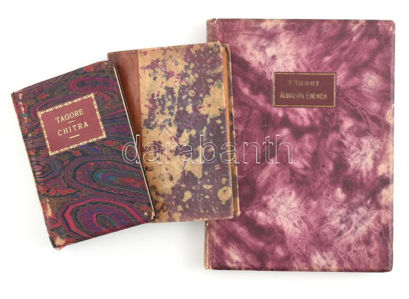 Rabindranath Tagore 3 műve: Áldozati énekek. (Gitanjali.) Ford.: Szentirmay Gizella. Bp., 1921, "Világirodalom",(Pápai Ernő-ny.) II. kiadás. Jaschik Álmos könyvdíszeivel. Kiadói kartonált papírkötésben, kissé kopott borítóval. Megjelent 2000 példányban. Számozatlan példány.; A postahivatal. A letétemény. Szerencséthozó pillanat, Élő vagy halott? Ford. Bartos Zoltán és Sármay Márton. Bp., 1921., Világirodalom. Kiadói félbőr-kötés, kissé kopott borítóval, a könyvtest részben elvált a borítótól, a címlap elvált a könyvtesttől. Számozatlan példány.; Chitra. Ford.: Laky Dezső. Bp., 1920., Sacelláry. Kiadói kartonált papírkötés, kopott, hiányos gerinccel, kopott borítóval. Számozatlan példány.;