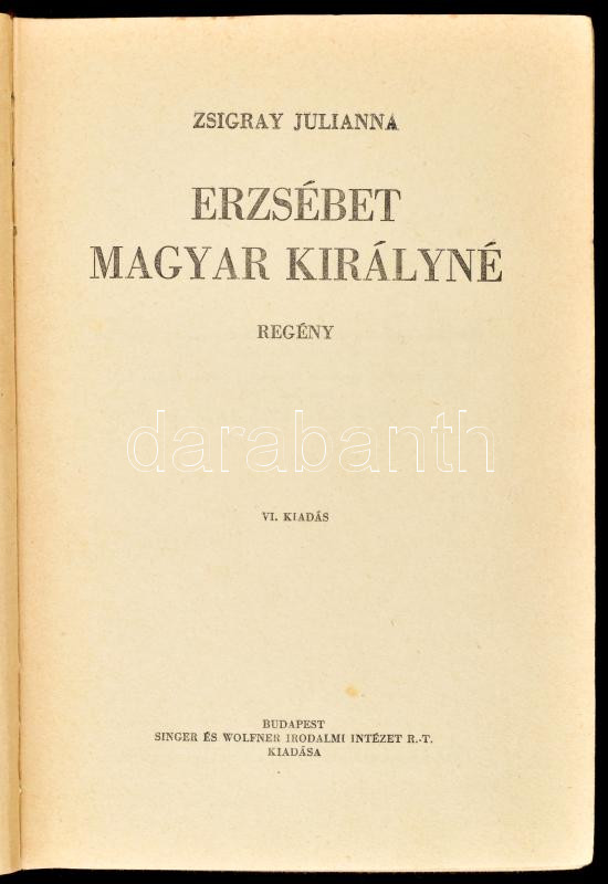 Zsigray Julianna: Erzsébet magyar királyné. Bp., 1943, Singer és Wolfn... https://www.darabanth.com/en/438-Online-auction/438.0/Books/Books-Other-rarities~1000027/Zsigray-Julianna-Erzsebet-magyar-kiralyne-Bp-1943-Singer-es-Wolfner-463-p-Hatodik-kiadas~II2864227