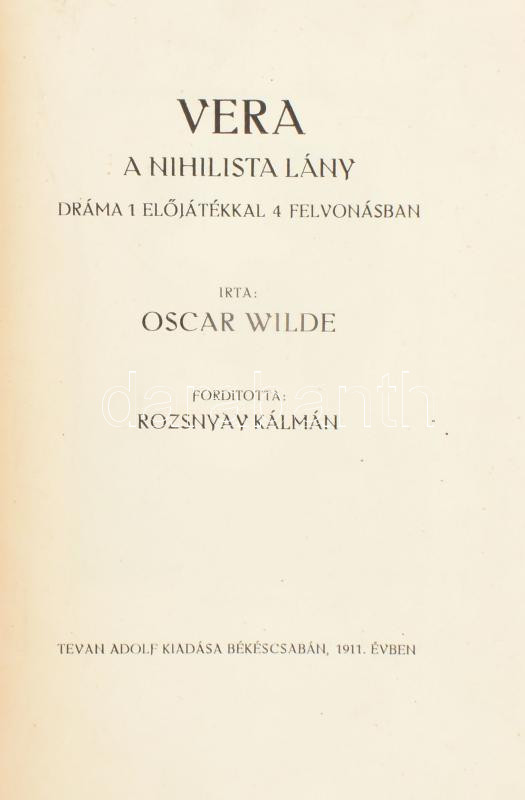 Oscar Wilde: Vera. A nihilista lány. Dráma 1 előjátékkal 4 felvonásban. Ford.: Rozsnay Kálmán. Békéscsaba, 1911., Tevan Adolf, 108+1 p. A címlapot Kozma Lajos, az arcképet fába metszette F. Schuhmacher. Oscar Wilde fametszetű portréjával. Kiadói illusztrált papírkötés, szép, igényes gyűjtői állapotban.