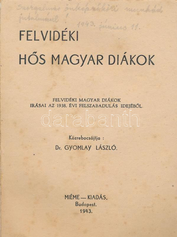 1943 Gyomlay László: Felvidéki hős magyar diákok. Felvidéki magyar diá... https://www.darabanth.com/en/438-Online-auction/438.0/Books/Books-Travelling-Local-History~1000008/1943-Gyomlay-Laszlo-Felvideki-hos-magyar-diakok-Felvideki-magyar-diakok-irasai-az-1938-C3~II2861013