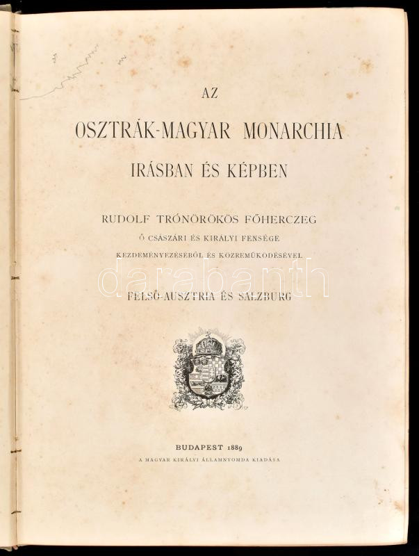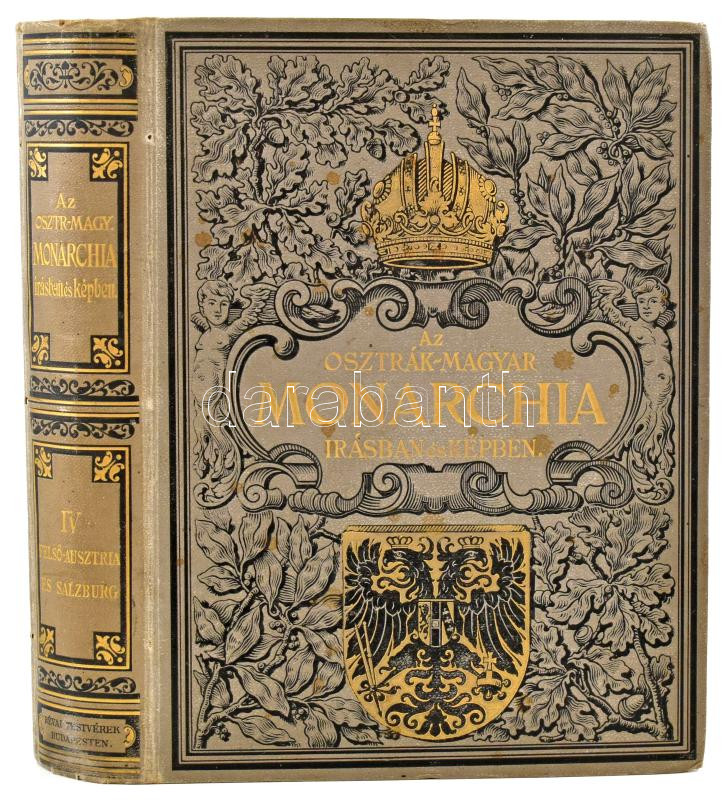 Az Osztrák-Magyar Monarchia írásban és képben IV. kötet: Felső-Ausztria és Salzburg. Bp., 1889., M. Kir. Államnyomda, XIV p.+8 sztl. lev.+1 t. +604 p.+2 t. Gazdag egészoldalas, és szövegközti képanyaggal illusztrált. Kiadói dúsan aranyozott, festett egészvászon-kötés, Gottermayer-kötés, márványozott lapélekkel, kissé kopott borítóval, kissé foltos, néhol firkált lapokkal, a hátsó szennylap sérült.