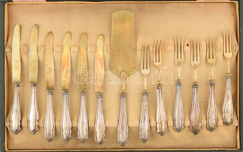 Ezüst (Ag) nyelű süteményes készlet, aranyozott, jelzett, hat személye...