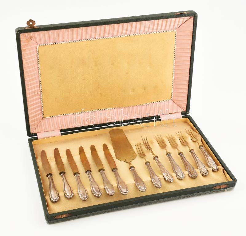 Ezüst (Ag) nyelű süteményes készlet, aranyozott, jelzett, hat személyes díszdobozban
