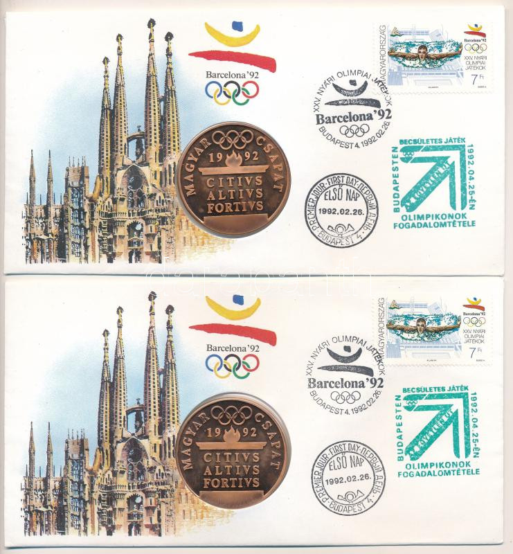 Description: Magyarország 1992. Papp László (1947-) "Barcelonai Olimpia- Magyar Csapat" bronz emlékérem érmés borítékban (2x), bélyeggel, első napi és alkalmi bélyegzéssel (42,5mm) T:UNC