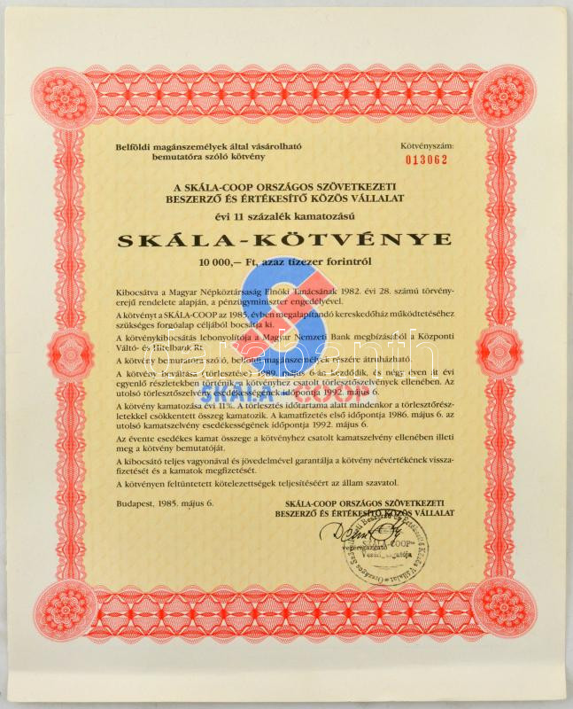 Description: Budapest 1985. "Skála-Coop Országos Szövetkezeti Beszerző és Értékesítő Közös Vállalat" Skála-kötvénye 10.000Ft-ról szelvények nélkül, bélyegzésekkel T:XF kis oldalsó beszakadás