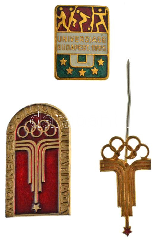 1965. "Universiade Budapest 1965" zománcos aranyozott bronz jelvény + 1980. "Moszkva 80 - Olimpia" műgyantás Al jelvény (32x19mm) + moszkvai olimpiai jelvény (27x14mm) + a moszkvai olimpia kabalaállatát ábrázoló textil falikép (395x290mm) T:1
