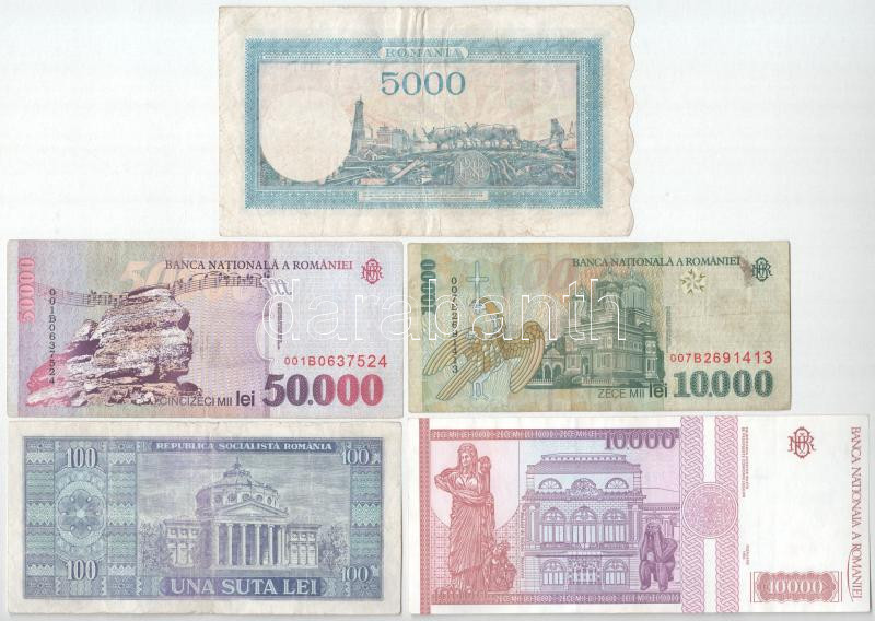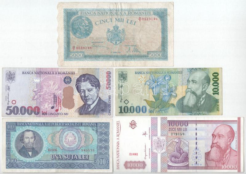 Description: Románia 1945. 5000L + 1966. 100L + 1994. 10.000L + 1999. 10.000L + 2000. 50.000L T:F közte szép papír, folt, kis szakadás
