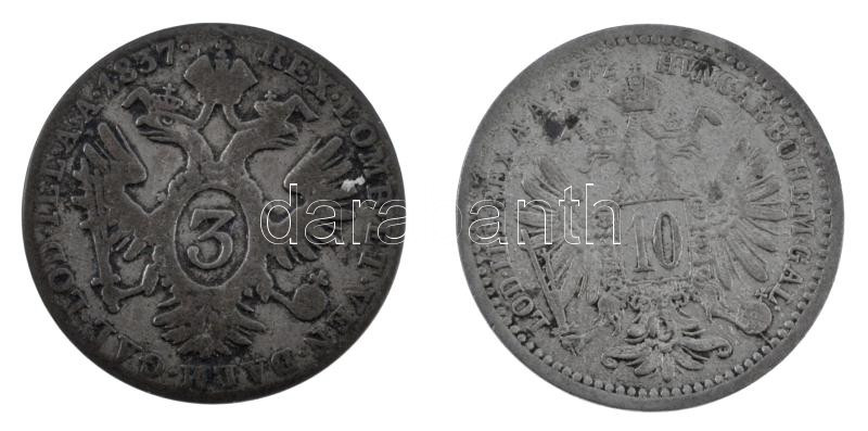 Ausztria 1837A 3kr Ag "I. Ferdinánd" + 1872. 10kr Ag "F... https://www.darabanth.com/en/438-Online-auction/438.0/Numismatics/Worldwide-silver-and-metal-coins~1500014/Ausztria-1837A-3kr-Ag-I-Ferdinand-plus-1872-10kr-Ag-Ferenc-Jozsef-TVF-F-Austria-1872-10-Kreuz~II2856929