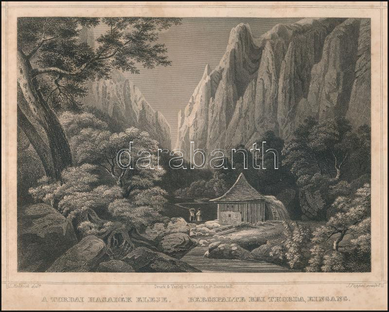 cca 1850 Ludwig Rohbock (1820-1883) - J(ohann) Poppel (1807-1882): A tordai hasadék eleje. Bergspalte bei Thorda, Eingang, Darmstadt, G. G. Lange, acélmetszet, papír, jelzett a metszeten, paszpartuban, foltos, 12x17 cm, paszpartu: 24x28 cm