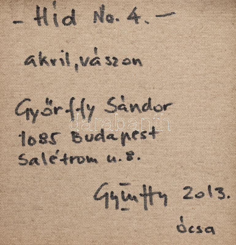Győrffy Sándor (1951-): Híd No. 4, 2013. Akril, vászon, jelzett a háto... https://www.darabanth.com/en/438-Online-auction/438.0/Paintings-and-graphics/Paintings-and-graphics~500001/Gyorffy-Sandor-1951-Hid-No-4-2013-Akril-vaszon-jelzett-a-hatoldalan-Reprodukalva-G~II2858225