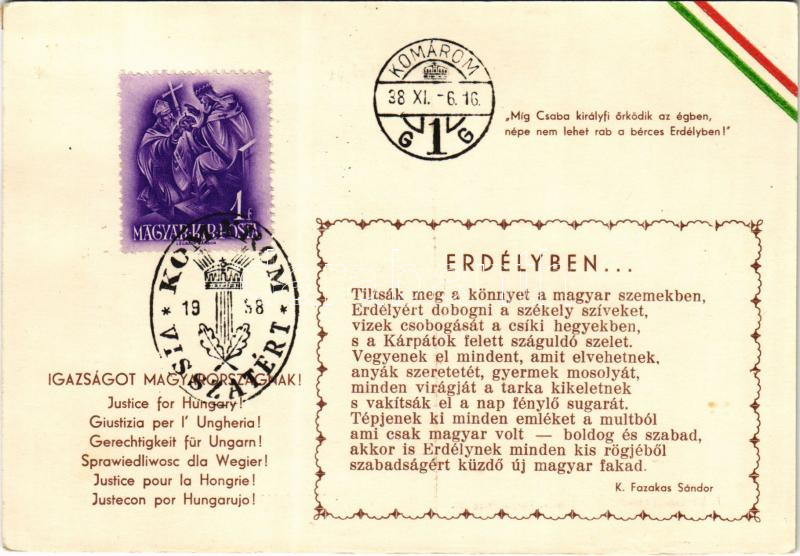 Description: Igazságot Magyarországnak! Míg Csaba királyfi őrködik az égben, népe nem lehet rab a bérces Erdélyben! / Justice for Hungary! Hungarian irredenta propaganda with Hungarian flag decoration + "1938 Komárom visszatért" So. Stpl. (EK)