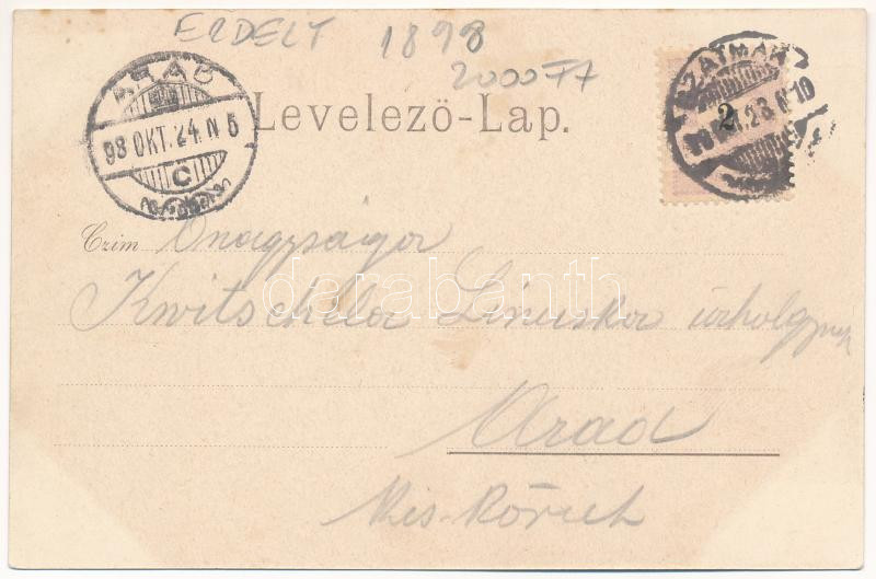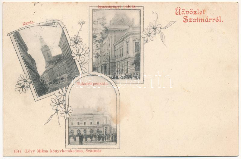 1898 (Vorläufer) Szatmárnémeti, Satu Mare; zárda, Igazságügyi palota, takarékpénztár, Első magyar általános biztosító társaság, Hazai iparcsarnok, Gőzmalom Társulat, Páskuj Imre üzlete. Lövy Miksa kiadása / nunnery, palace os justice, savings bank, shops, insurance company. Art Nouveau, floral