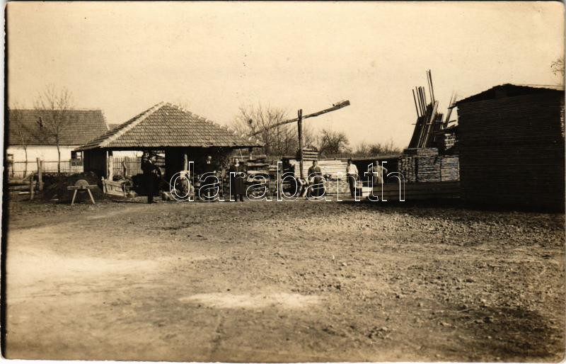 Ismeretlen erdélyi (?) település, fatelep, gémeskút / Transylvanian folklore, lumber yard. photo