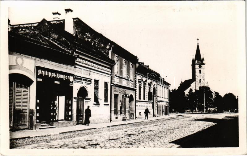 Szászrégen, Reghin; utca, templom, Philippi & Langer könyvnyomda üzlete és saját kiadása / street, church, shops