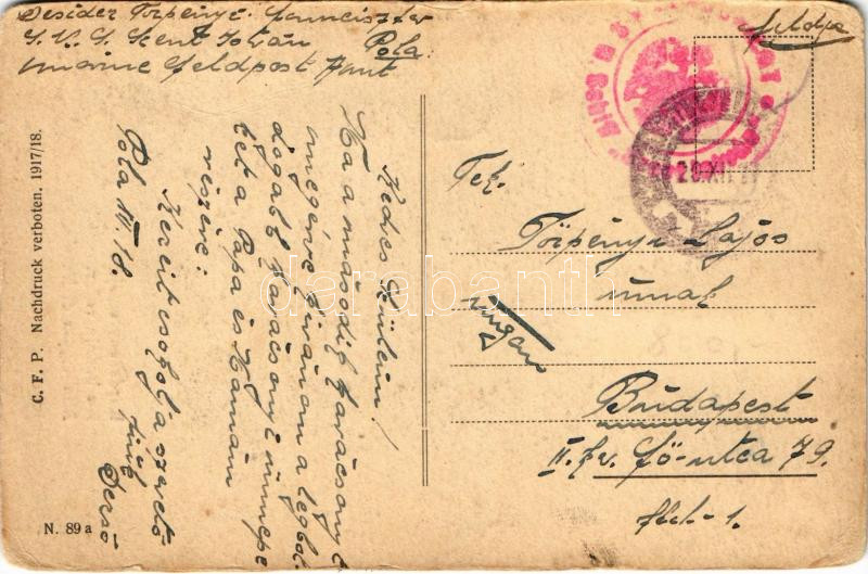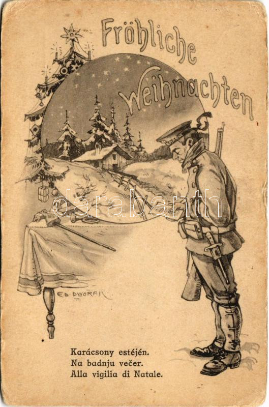 Fröhliche Weihnachten! K.u.K. Kriegsmarine Matrose / Alla vigilia di Natale / Karácsony estéjén / WWI Austro-Hungarian Navy mariner humour art postcard, Christmas greeting. C.F.P. 1917/18. N. 89a.. s: Ed. Dworak (kopott sarkak / worn corners)
