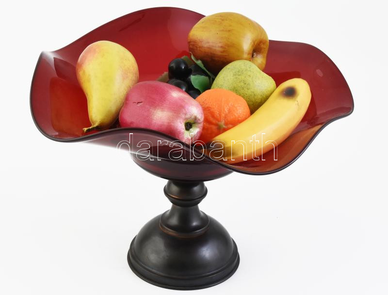 cca 1920 Vörös üveg kínálótál réztalpon d: 35 cm Mű gyümölcsökkel
