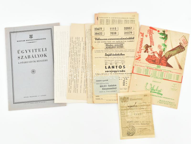 Description: 1947 Magyar Osztálysorsjáték. Ügyviteli szabályok a főárusítók részére. Bp., Hungária Hírlapnyomda Rt., 15+(1) p. Tűzött papírkötés, jó állapotban. 500 pld. + Osztálysorsjáték reklámlapok, levelek, játékterv, elismervény, össz. 8 db