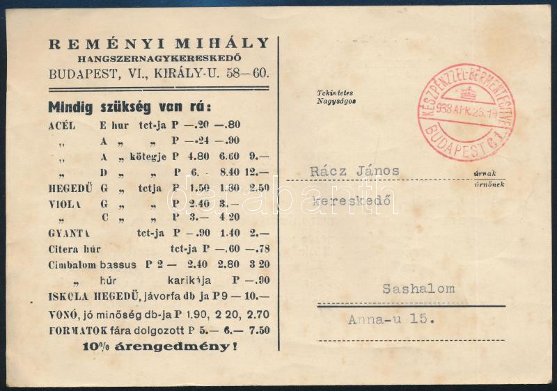 cca 1940 Reményi Mihály hangszerkészítő reklám levelezőlap árjegyzékke...