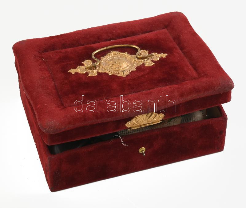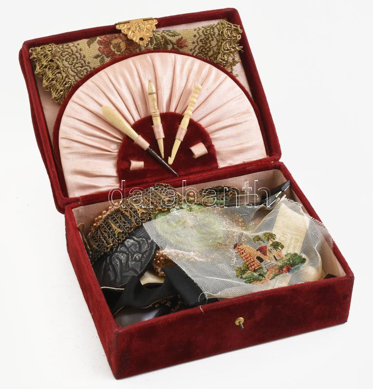 Bordó bársony varródoboz, díszes aranyszínű veretekkel, fogantyúval, tartalommal (csont horgolótűk, különféle bizsuk, ékszerek, tűgobelin, csokornyakkendő, stb.), némi kopással, 19x15x7 cm