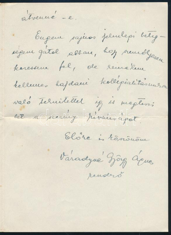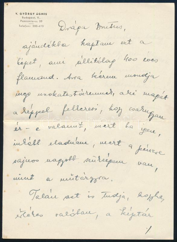 cca 1940 Váradyné György Ágnes rendező levele Sárdy Brutus (1892-1970)... https://www.darabanth.com/en/439-Online-auction/439.0/Art-and-other-collectibles/Historical-documents-manuscripts~1000021/cca-1940-Varadyne-Gyorgy-Agnes-rendezo-levele-Sardy-Brutus-1892-1970-festomuvesz-restaur~II2874404