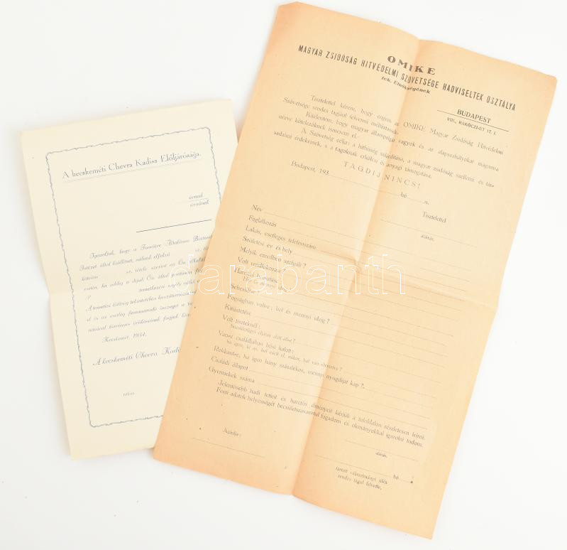 cca 1930 2 judaika nyomtatvány: Chevra Kadisa, OMIKE