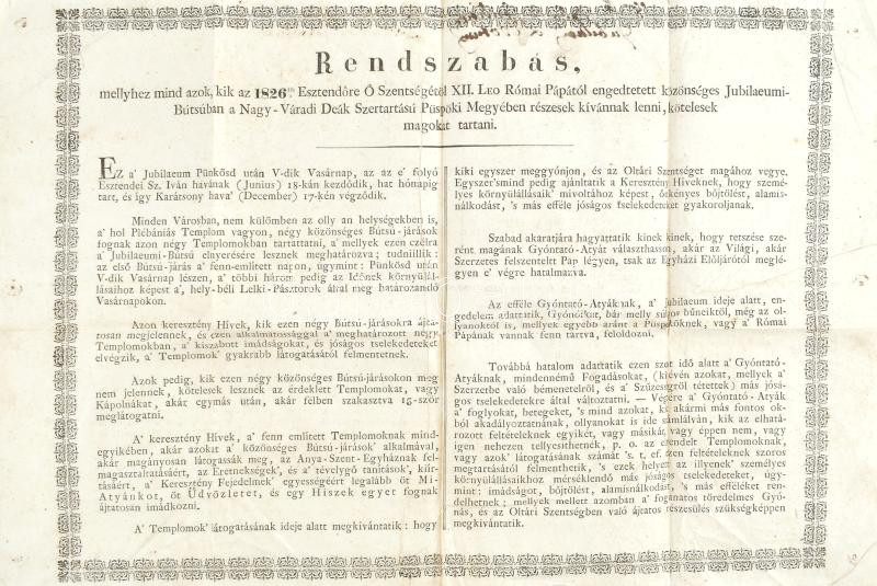 1826 Nagyvárad rendszabás az 1826 évi jubileumi búcsú résztvevői számára