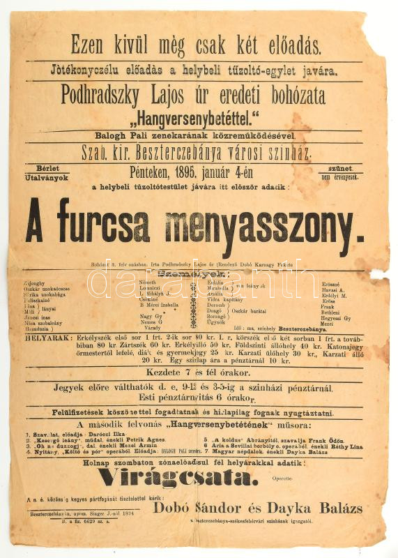 1895 Besztercebánya, A furcsa menyasszony című Podharaszky Lajos bohózat műsoros plakátja, szakadásokkal, 43×30 cm