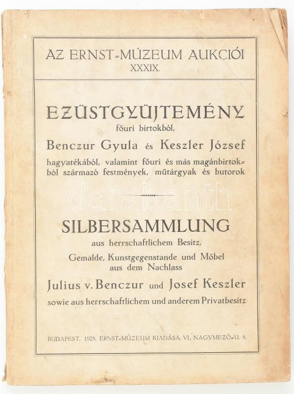 Az Ernst Múzeum aukciói: Ezüstgyűjtemény főúri birtokból Benczur Gyula és Keszler József hagyatéka Bp., 1928. Kiadói papírkötésben