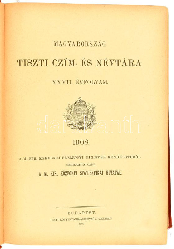 1908 Magyarország tiszti czím- és névtára XXVII. évf. Szerk. A M. Kir.... https://www.darabanth.com/en/439-Online-auction/439.0/Books/Books-Military~1500014/1908-Magyarorszag-tiszti-czim-es-nevtara-XXVII-evf-Szerk-A-M-Kir-Kozponti-Statisztikai-~II2886492
