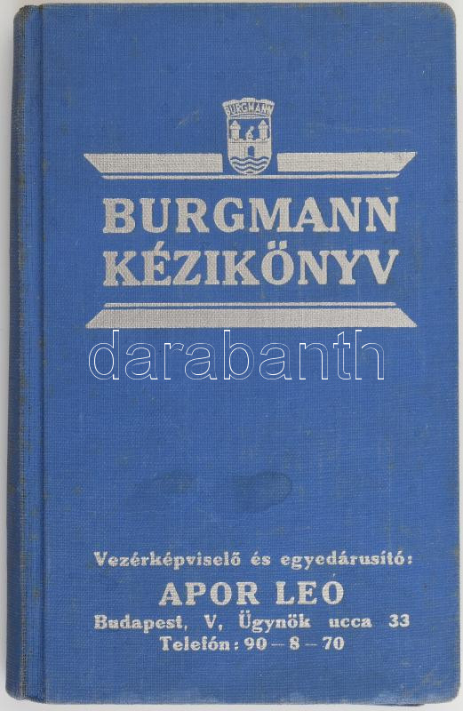 Description: Burgmann kézikönyv. Burgmann Feodor asbest- és tömszelencetömítések gyárainak magyarországi üzemének évkönyve. Bp., [1934], Apor Leó (Tolnai-ny.), 192 p. Fekete-fehér és színes képekkel, ábrákkal gazdagon illusztrált. 2 db reklám levelezőlappal. Kiadói egészvászon-kötés, kissé kopottas borítóval.