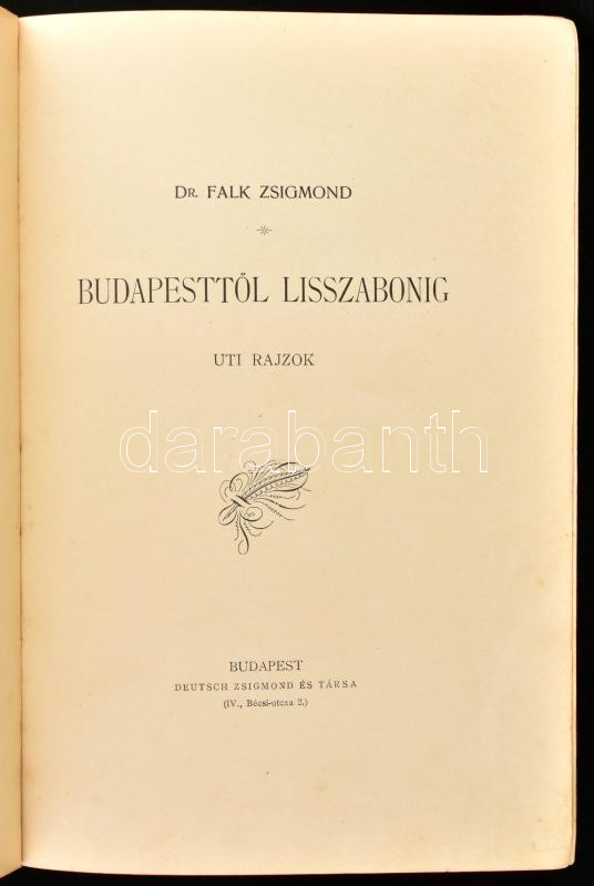 Dr. Falk Zsigmond: Budapesttől Lisszabonig. Uti rajzok. Bp.,é.n., Deutsch Zsigmond és Társa. . Kiadói kissé koszos Frank és Werner egészvászon kötésben. Hátsó előzéklap nélkül.