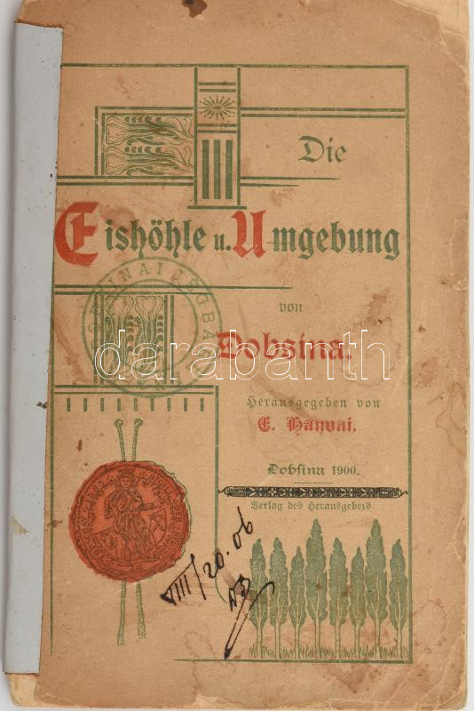 Description: E. (Eduard) Hanvai (szerk.): Eishöhle u. Umgebung von Dobsina. Dobsina, 1900, szerkesztői kiadás. 28 p + 1 kihajtható térkép melléklet. Német nyelven. Fekete-fehér képekkel és ábrákkal illusztrált. Kiadói papírkötés, ragasztott gerinccel, sérült és foltos borítóval, könyvtest elvált a borítótól, térkép jó állapotban.