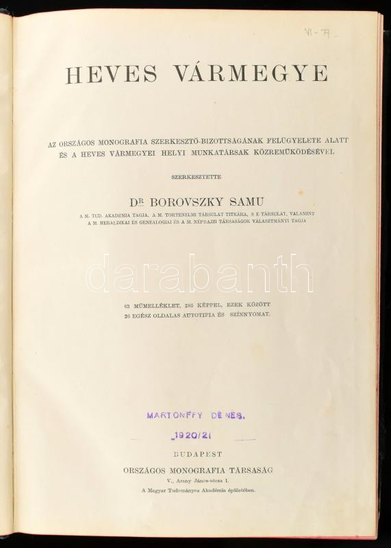Heves vármegye. Szerk.: Dr. Borovszky Samu. Magyarország vármegyéi és városai. Magyarország monográfiája. Bp., [1909], Országos Monográfia Társaság (Légrády-ny.), X+699 p. + 3 t. (képmellékletek) + 1 t. (kihajtható, színes térkép). Gazdag szövegközi és egészoldalas képanyaggal illusztrálva. Kiadói aranyozott, festett, dombornyomott egészvászon-kötés, Gottermayer-kötés, festett lapélekkel, sérült, ragasztott gerinccel, néhány szakadt, sérült lappal.