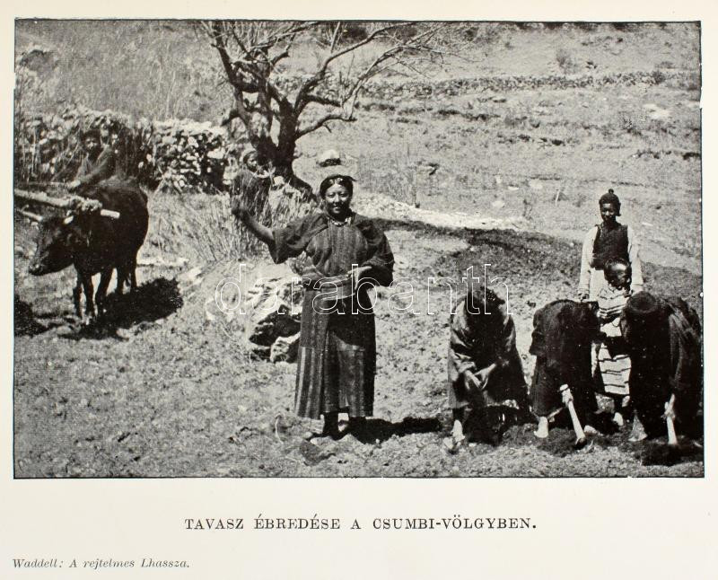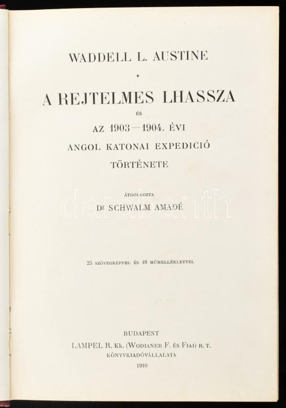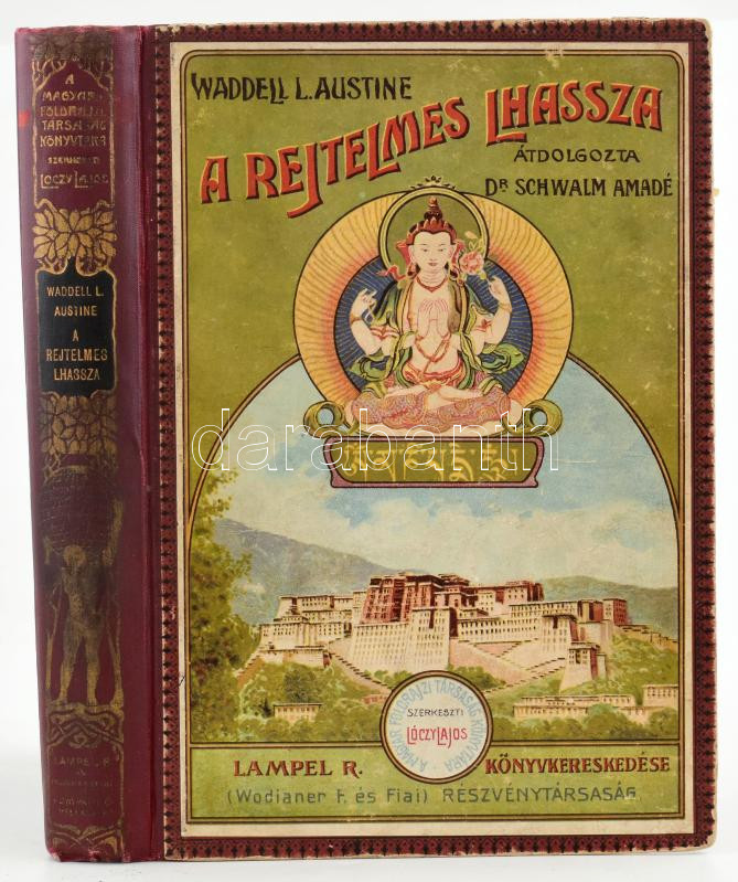 [Waddell, Laurence Austine (1854-1938)]: A rejtelmes Lhassza és az 1903-1904. évi angol katonai expedíció története. Átdolgozta Dr. Schwalm Amadé. Lóczy Lajos előszavával. A Magyar Földrajzi Társaság Könyvtára. Bp., 1910, Lampel R. (Wodianer F. és Fiai), 1 (címkép, színes) t. + VI+(2)+287+(1) p. +42 (fekete-fehér képtáblák) t. + 2 (kétoldalas térképek) t. + 1 (kihajtható térkép) t. Gazdag szövegközti képanyaggal illusztrált. Kiadói aranyozott gerincű, illusztrált félvászon-kötés, kissé sérült, kopottas borítóval.
