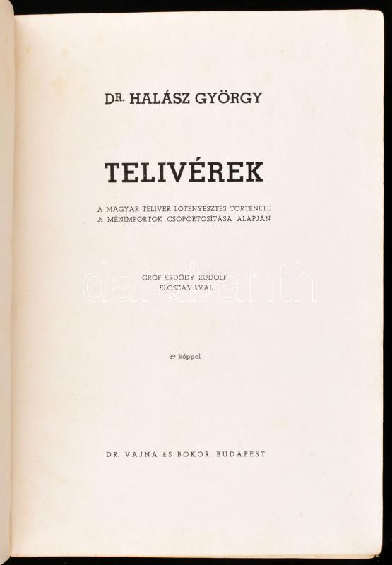 Halász György: Telivérek. A magyar telivér lótenyésztés története a ménimportok csoportosítása alapján. Gróf Erdődy Rudolf előszavával. Bp.,1944., Dr. Vajna és Bokor, (Klein S-ny.), 511+3 p. + 1 (kihajtható táblázat) t. Szövegközti és egészoldalas fekete-fehér fotóval illusztrált. Kiadói félvászon-kötés, kopott, foltos borítóval, javított, restaurált gerinccel.