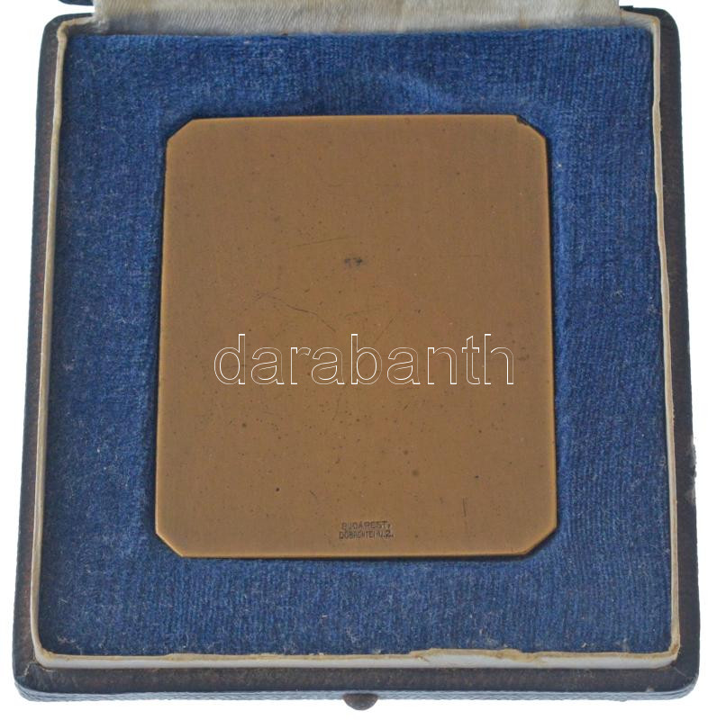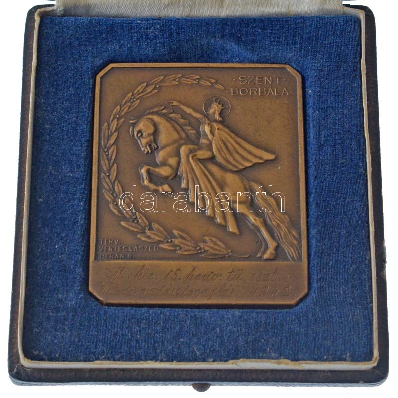 1942. "Szent Borbála" egyoldalas bronz emlékplakett, hátlapon "BERÁN N BPEST" gyártói jelzéssel, előlapon "M. KIR. 15. HONVD. TŰ. OSZT. HUBERTUS VADÁSZLOVAGLÁS 1942" eredeti jelzett "Berán Nándor" gyártói tokban. Szign.: Vértes László / Berán Nándor (67,5x55mm) T:AU Hungary 1941. "Szent Borbála (Saint Barbara)" one-sided, bronze plaque, on reverse "BERÁN N BPEST" maker's mark, "Hubertus Hunting Ride of the 15th Hungarian Royal Honvéd Artillery Battalion 1942" Sign.: Nándor Berán, László Vértes (36,34g/67,5x55mm) C:XF edge error, scratch