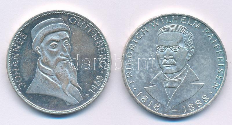 Description: Német Szövetségi Köztársaság 1968G 5M Ag "Gutenberg János halálának 500. évfordulója" + 1968J 5M Ag "Friedrich Raiffeisen születésének 150. évfordulója" T:AU Federal Republic Germany 1968G 5 Mark Ag "500th Anniversary - Death of Johannes Gutenberg" + 1968J 5 Mark Ag "150th Anniversary - Birth of Friedrich Raiffeisen" C:AU Krause KM#122