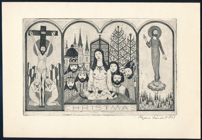 Nyári Lóránt (1928-1982): Karácsony (Christmas), 1975. Rézkarc, papír, jelzett, 13×20 cm