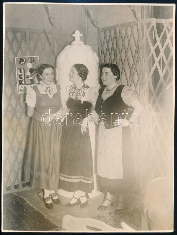 1937 Pick-estély, elegáns hölgyek egy Pick plakát mellett, hátoldalon ...
