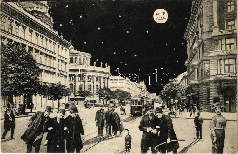 Description: Budapest VI. Váci körút (Bajcsy-Zsilinszky út) éjjel, villamos, Takarékpénztár, Schimmelpfeng W. tudakozó. Humoros montázs részeg férfiakkal / Humorous montage with drunk men at night (EB)